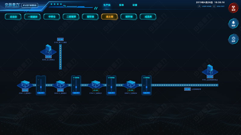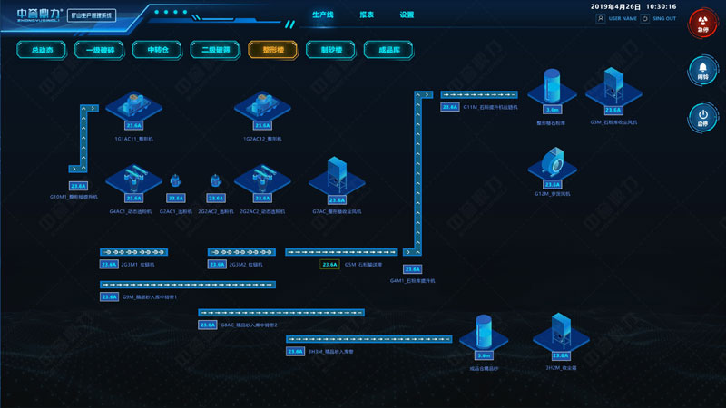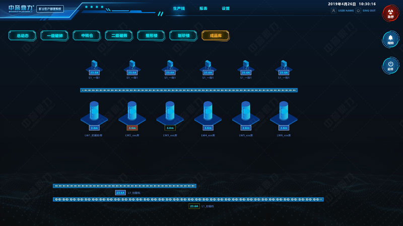 礦山生產(chǎn)管理系統(tǒng)三維形式展現(xiàn)整個生產(chǎn)線,可遠(yuǎn)程控制砂石骨料線的給料機(jī)、破碎機(jī)、皮帶機(jī)、制砂機(jī)、振動篩等各設(shè)備的啟停,通過傳感裝置感知設(shè)備運(yùn)行狀態(tài)(如設(shè)備溫度、電壓、電流、振頻等數(shù)據(jù)),可監(jiān)測生產(chǎn)線產(chǎn)量、各儲料倉料位高度等信息,自動生成報表,實現(xiàn)礦山生產(chǎn)環(huán)節(jié)的智能化操控管理及生產(chǎn)決策。