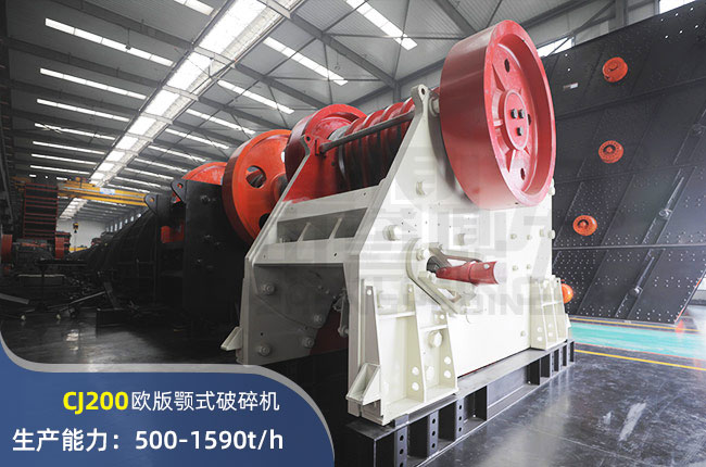 CJ200顎式破碎機(jī)進(jìn)料口尺寸2000×1500mm,進(jìn)料粒度1200mm,出料大小175-300mm,電機(jī)功率400kw,時(shí)產(chǎn)可達(dá)1590噸,屬于中型鄂破。