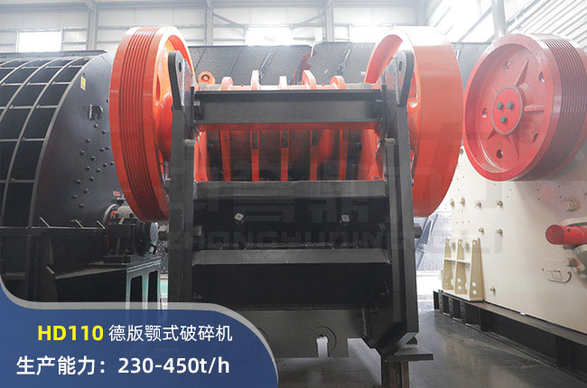 HD110(912)顎式破碎機進料口尺寸850×1100mm,進料粒度750mm,出料大小100-200mm,電機功率6p 132kw,時產(chǎn)可達450噸。