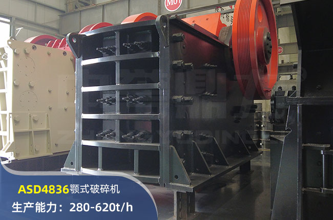 ASD4836顎式破碎機(jī)進(jìn)料口尺寸1220×910mm,進(jìn)料粒度≤850mm,出料大小≤75mm,電機(jī)功率160kw,時(shí)產(chǎn)在280-620噸左右。