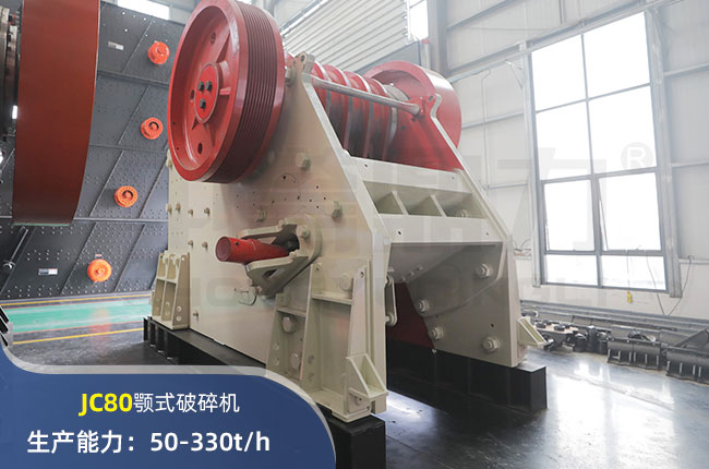JC80顎式破碎機進料口尺寸800×510mm,進料粒度≤430mm,出料大小≤40mm,電機功率75kw,時產(chǎn)量在330噸左右。