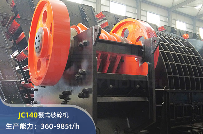 JC140顎式破碎機 進料口尺寸在1400×1070mm,進料粒度≤910mm,出料大小≤125mm,電機功率200kw,時產量在985噸左右。