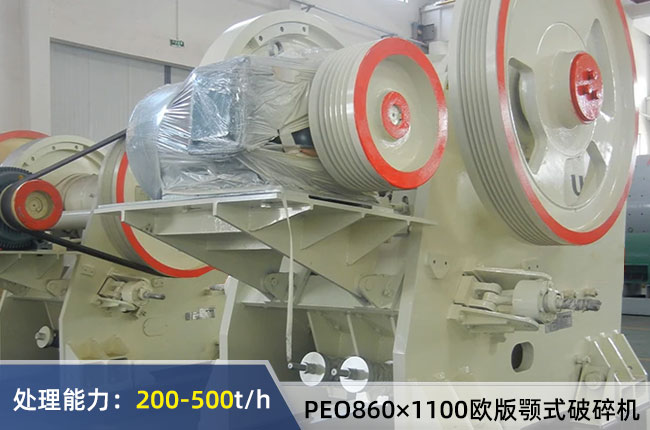 PEO860×1100歐版顎式破碎機(jī)進(jìn)料口尺寸860×1100mm,進(jìn)料粒度在720mm以下,配置電機(jī)功率為132-160kw,時(shí)產(chǎn)量在200-500噸,出料范圍100-225mm,重量32噸左右。