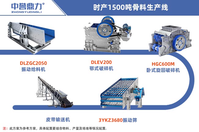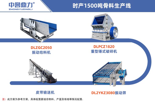 一條時(shí)產(chǎn)1500噸的骨料生產(chǎn)線需要用到破碎設(shè)備、給料設(shè)備、振動(dòng)篩分設(shè)備以及輸送設(shè)備和除塵設(shè)備等,設(shè)備的選擇比較靈活,本金不是很充足的可以選用重錘式破碎機(jī),一破成型。粒度可調(diào),不需要二破設(shè)備,本金充足可以選用鄂破+旋回破的配置方式,下面是兩種不同搭配方法: