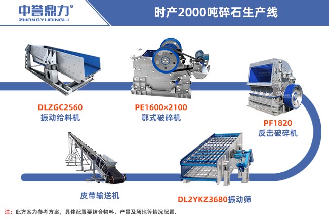 日產2萬噸石子生產線即時產2000噸石子生產線,一天工作10小時,具體配置可以用DLZGC2560振動給料機、PE1600×2100顎式破碎機、PF1820反擊式破碎機、DL2YKZ3680振動篩、輸送機等設備。本金充足條件許可的話,還可以搭配脈沖袋式除塵器減少粉塵污染,還有生產管理系統(tǒng)、自動裝車系統(tǒng)等智能化生產線軟件。配置清單如下: