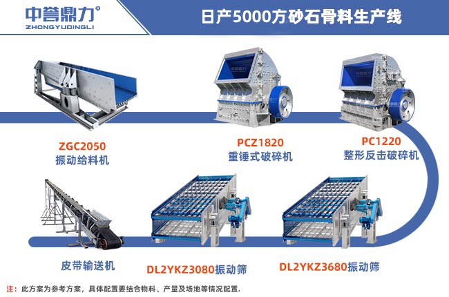 設(shè)備配置:PCZ1820重型錘式反擊破碎機(jī)、PC1220整形式破碎機(jī)、3YKZ3070系列振動(dòng)篩、輸送機(jī)等設(shè)備。