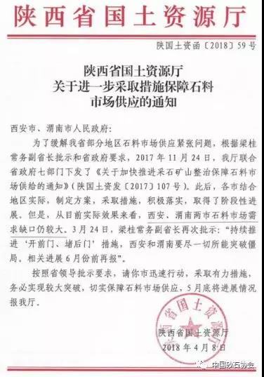 為了緩解我省部分地區(qū)石料市場供應(yīng)緊張問題,根據(jù)梁桂常務(wù)副省長批示和省要求,2017年11月24日,我廳聯(lián)合省七部門下發(fā)了《關(guān)于加快推進(jìn)采石礦山整治保障石料市場供給的通知》(陜土資發(fā)[2017]107號(hào))。此后,各市結(jié)合地區(qū)實(shí)際,制定方案,采取措施,積落實(shí),取得了階段性進(jìn)展。但是,從目前實(shí)際效果來看,西安、渭南兩市石料市場需求缺口較大。3月24日,梁桂常務(wù)副省長再次批示:“持續(xù)推進(jìn)‘開前門、堵后門’措施,西安和渭南要盡所能僵局。相關(guān)進(jìn)展6月份前再報(bào)”。