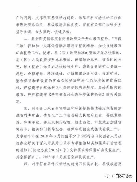 3、對(duì)于開山采石專項(xiàng)整治和環(huán)境督察整改保留的建筑石料類礦山,恢復(fù)生產(chǎn)工作由縣級(jí)人民負(fù)責(zé),要抓緊整改、完善手續(xù),并組織制定、檢查驗(yàn)收,市級(jí)加強(qiáng)督促指導(dǎo),相關(guān)部門指導(dǎo)配合,年底前完成整改驗(yàn)收工作,力爭每個(gè)市在2018年3月底前不少于50%符合《陜西省人民辦公廳關(guān)于深入開展開山采石專項(xiàng)整治切實(shí)加強(qiáng)采石場管理的通知》文件要求的保留礦山恢復(fù)生產(chǎn)。其余保留礦山,2018年6月底前部恢復(fù)生產(chǎn)。