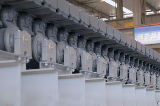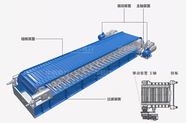 板式給料機(jī)的組成部分包括機(jī)架、主軸裝置、驅(qū)動(dòng)裝置(電動(dòng)機(jī)、聯(lián)軸器、減速器)、鏈板裝置、拉緊裝置、支重輪、托鏈輪等。