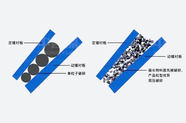 粒間層壓破碎,合理利用物料間的相互擠壓,在提升破碎效率、成品比例的同時,較大程度上減少了傳統(tǒng)圓錐破針片狀含量大的問題,實現(xiàn)破碎粒度均勻、粒形、級配更合理。