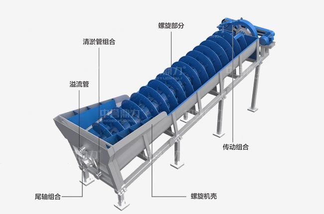 中譽(yù)鼎力螺旋洗砂機(jī)的結(jié)構(gòu)組成包括尾軸組合、螺旋機(jī)殼、傳動組合、螺旋部分、清淤管組合、溢流管。