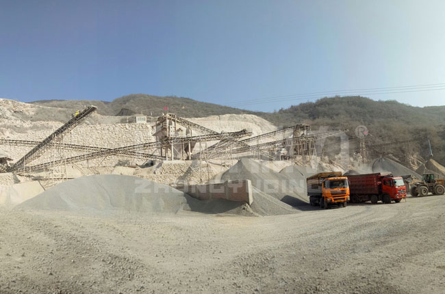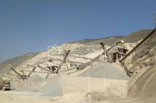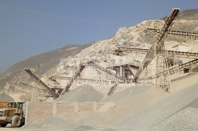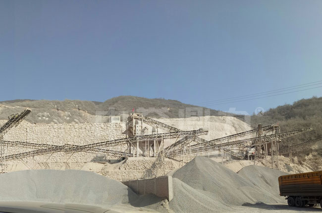 該項(xiàng)目是2017年投入生產(chǎn),是一條生產(chǎn)12、13等石子骨料的石灰石粉碎生產(chǎn)線,主要采用的是1615型頭道破碎機(jī)+1216整形破+振動(dòng)篩。