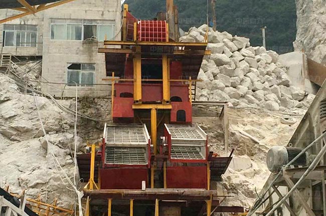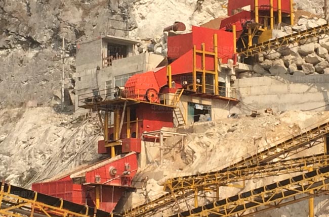 原石料通過卸料倉,由棒條式給料機對原料進行預(yù)處理,篩下的石料通過振動篩篩選,反擊破細(xì)碎,再次篩分,其余大規(guī)格的骨料通過給料機均勻連續(xù)送進1615重錘破破碎,直接通過振動篩篩分,部分大規(guī)格石料會經(jīng)過反擊破二次加工,其余混合料通過振動篩篩分不同規(guī)格的石料。
