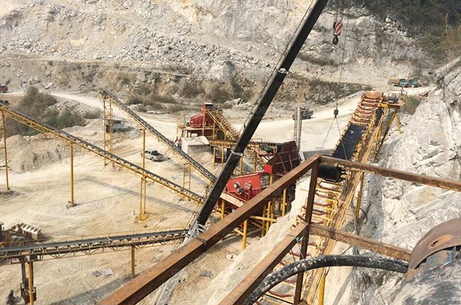 根據(jù)現(xiàn)場地勢,采用階梯式設(shè)計,給料機下重錘破,重錘破下直接跟兩臺振動篩篩分碎石料,部分符合成品要求的石料會通過皮帶機送至成品料堆,其余大規(guī)格的會在反擊破進行二次破碎。
