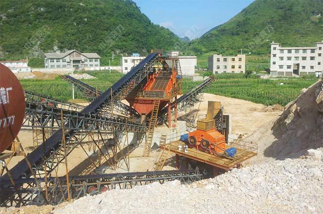 該砂場(chǎng)案例位于貴州安順平壩地區(qū),于2016年建成投產(chǎn),原料是山石,在工藝上選用了重錘破+雙轉(zhuǎn)子制砂機(jī)的破碎制砂模式,一小時(shí)可以生產(chǎn)300噸機(jī)制砂,項(xiàng)目占地面積小,總投資較低。