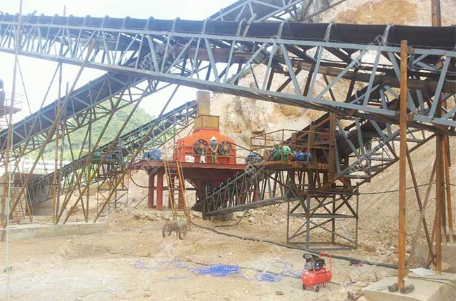 山上的石頭入振動(dòng)給料機(jī),由給料機(jī)除去泥土后送進(jìn)重錘破碎機(jī)內(nèi)進(jìn)行粗碎處理,出來的料進(jìn)過篩分后,符合進(jìn)料粒度的進(jìn)入雙轉(zhuǎn)子制砂機(jī)內(nèi)生產(chǎn)機(jī)制砂,不符合進(jìn)料粒度的再返回重錘破內(nèi)進(jìn)行破碎,形成閉路循環(huán)。