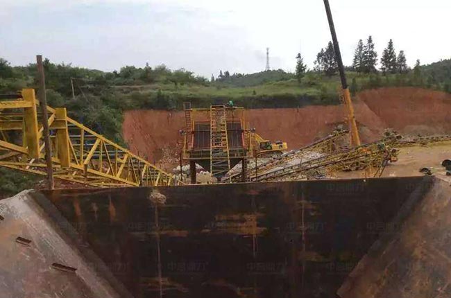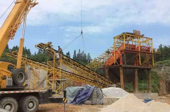 貴州凱里時(shí)產(chǎn)300噸石灰?guī)r破碎機(jī)生產(chǎn)線,采用一臺(tái)ZG1238給料機(jī)、一臺(tái)PCZ1512重錘破碎機(jī)、兩臺(tái)3YK1860振動(dòng)篩和皮帶機(jī),工藝流程簡(jiǎn)單,出3種不同規(guī)格的成品骨料。