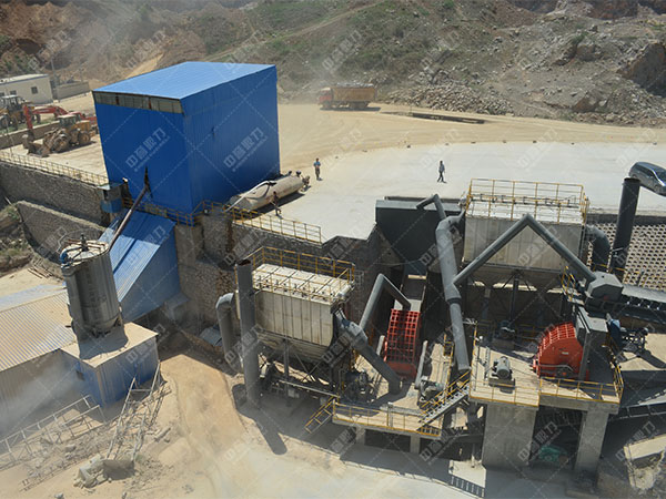 大塊礦石經(jīng)料堆由振動(dòng)喂料機(jī)均勻送入顎破進(jìn)行初級粉碎,初級粉碎后的礦石再由傳送設(shè)備運(yùn)輸給圓錐碎石機(jī)進(jìn)行中整型破碎,然后經(jīng)礦山振動(dòng)篩篩選分級,大于40毫米的礦石重新返回圓錐碎石機(jī),40毫米以下的礦石由傳送設(shè)備送入打砂機(jī)進(jìn)行整形,整形后的成品經(jīng)由礦山振動(dòng)篩篩選分級,由傳送設(shè)備運(yùn)輸至成品區(qū)。