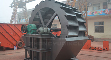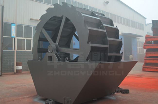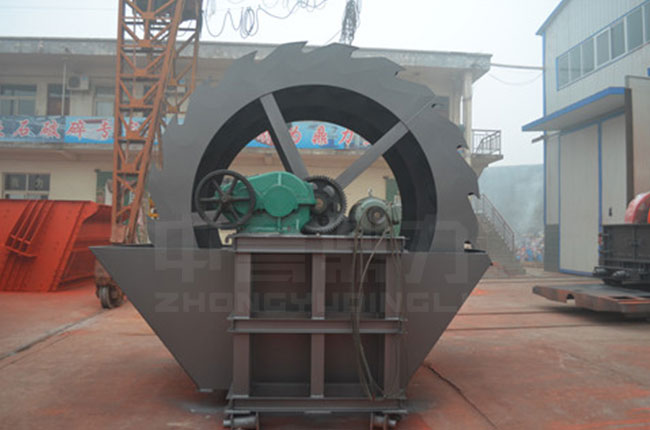 工作時,在電機(jī)的帶動下三角帶、減速機(jī)、齒輪減速后帶動葉輪進(jìn)行轉(zhuǎn)動,石粉物料由給料槽進(jìn)入洗槽中,在葉輪帶動下翻滾,等除去石粉表面雜質(zhì)后完成清洗,從溢出口洗槽排出。干凈的石粉由葉片帶走,然后砂石從旋轉(zhuǎn)的葉輪倒入出料槽。