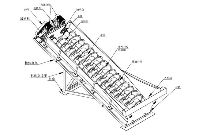 雙螺旋洗沙機組成結構包含支架、槽體、電機、減速機、中心軸、螺旋葉片等組成。