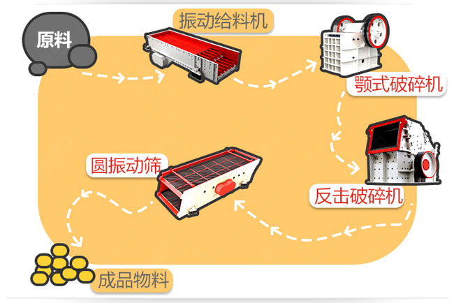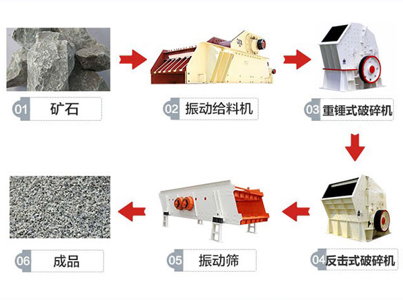 配置機(jī)械:重反擊錘式破碎機(jī)+震動(dòng)喂料機(jī)+振動(dòng)篩分設(shè)備+傳送機(jī)